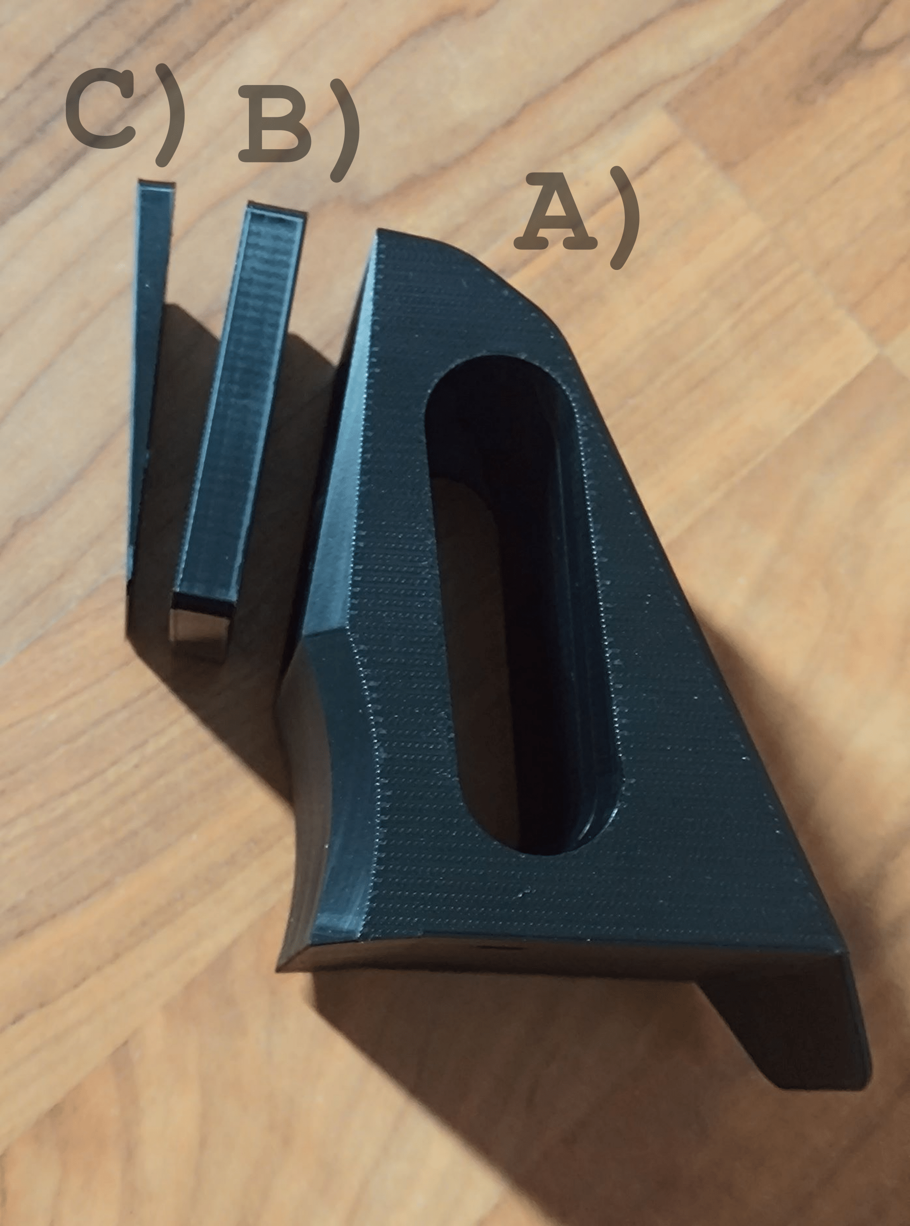 – B) Vymezovací distanční podložka. Pokud má telefon konektor pro nabíjení dole, je možné ho pomocí této podložky předsadit tak, aby kablík napájení nekolidoval s hlavním displayem motorky. Standardně o tloušťce 10mm. Pokud chcete jinou tloušťku, stačí připsat poznámku k objednávce, nebo nám zavolat.